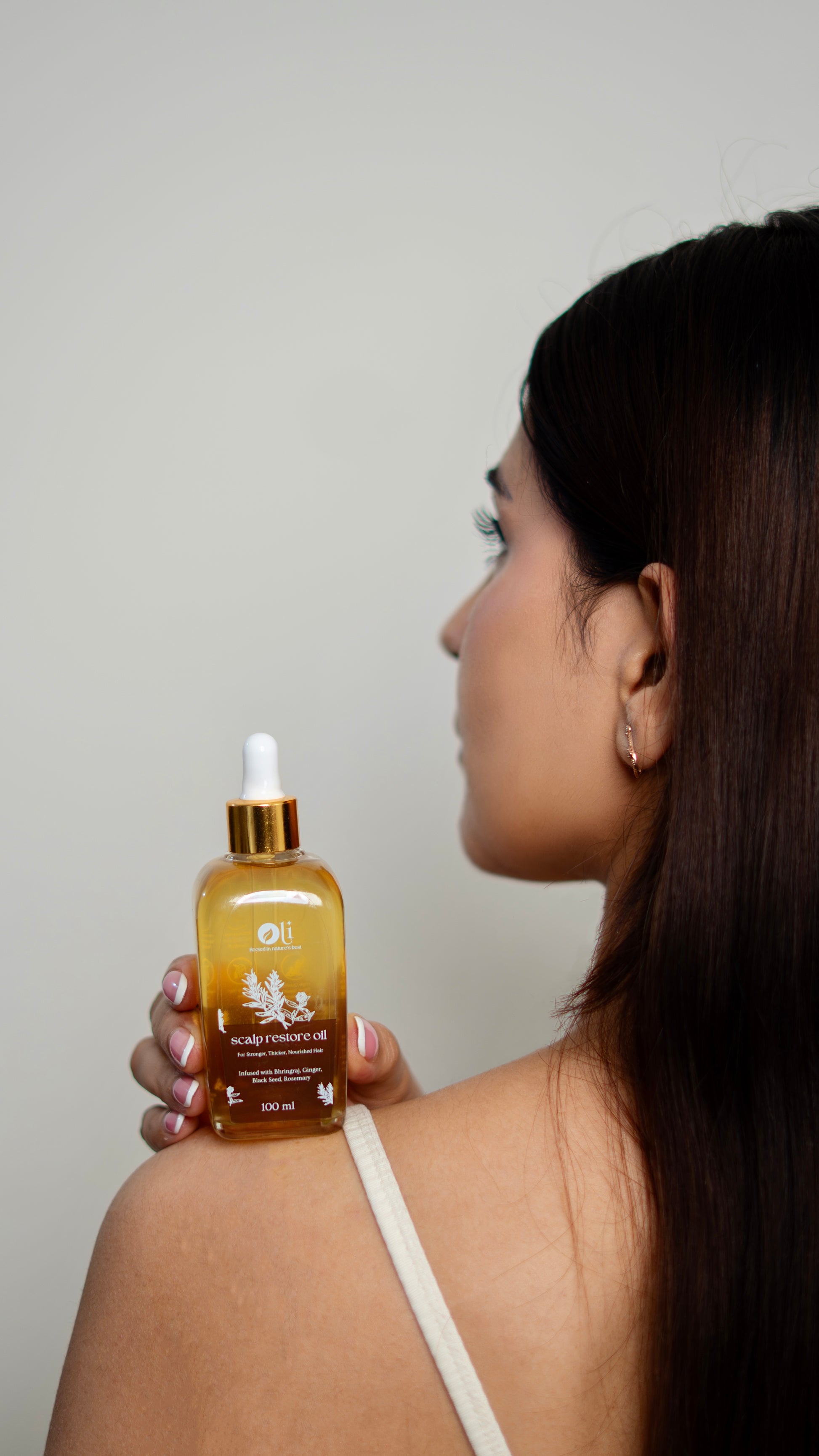 Oli Scalp Restore Oil is your ultimate solution for healthier, stronger, and shinier hair. Crafted with over 15 carefully chosen natural ingredients, this luxurious oil is designed to restore balance, rejuvenate your scalp, and bring your hair back to life.